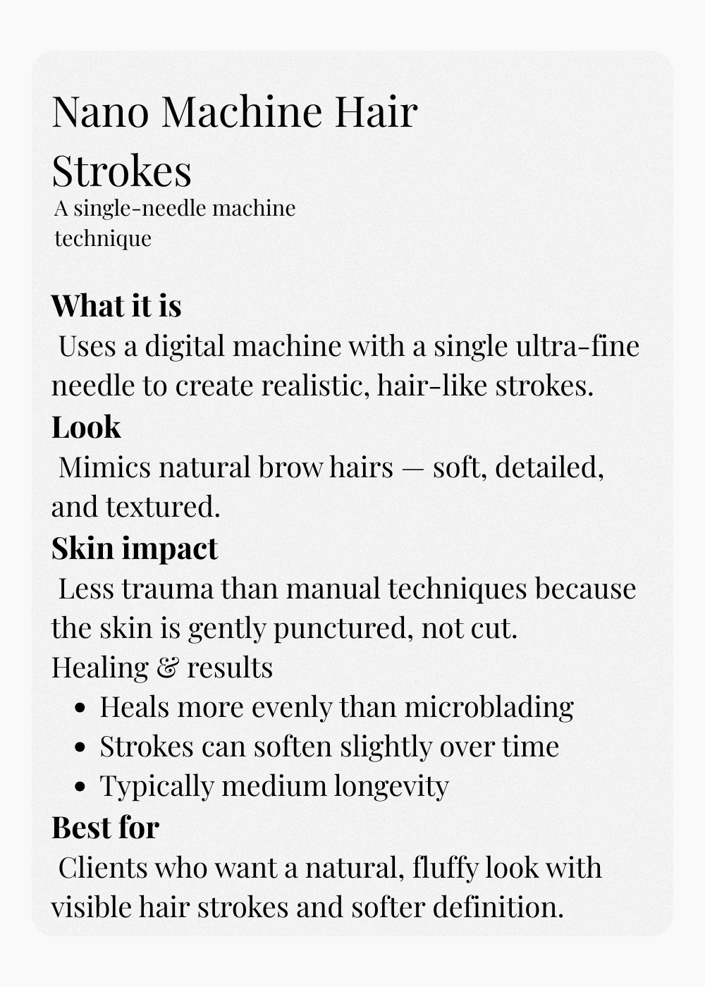 This session typically takes 2 hours and focuses on building the foundation of your brows. Immediately after, your brows may appear darker and more defined this is completely normal and will soften as they heal.